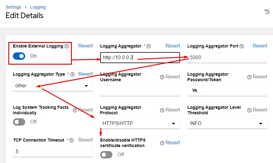 From here you need to make several changes following the numbers below. You won't be able to save the External Logging until the URL is set. So, following the order is important: