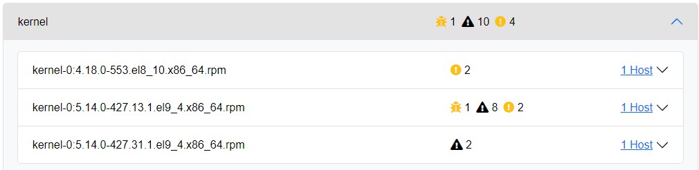 Clicking on an individual package will reveal a list of affected package versions along with the hosts that each applies to. If one of the host entries is clicked, it will take you to the current packages section and apply a filter that reveals the affected host or hosts.