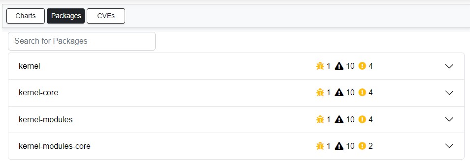Clicking the Packages tab provides a sorted list of all packages on any host that may have CVEs.