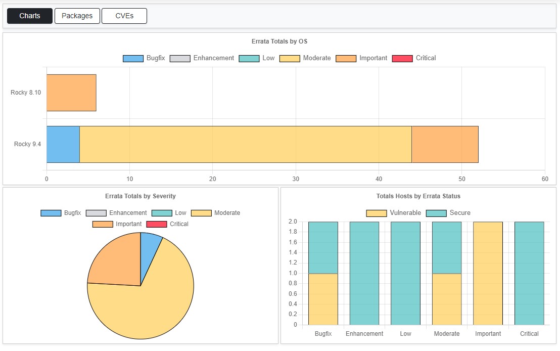 Ascender Ledger Pro collects errata data for Enterprise Linux (EL) OSs. This includes RHEL, Rocky, Alma, and Oracle Linux. The errata section is built by comparing the EL Common Vulnerability and Exposures (CVE) database with the packages that are currently installed on hosts in your environment. If a package installed is not the newest version and has CVE information, it will appear in the listings.