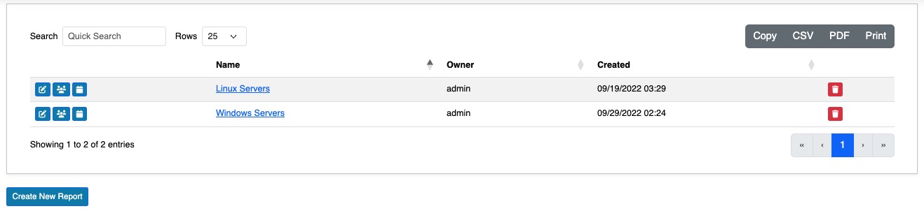From the main Reports interface, you can see all the listed reports that have been created, along with action buttons. These action buttons include: